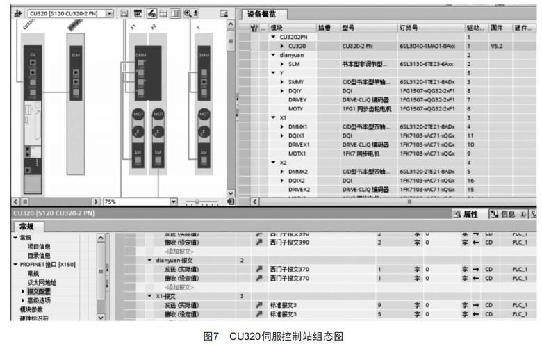 在本控制系統(tǒng)開發(fā)中,伺服控制組件選型及組網(wǎng)極為關(guān)鍵,堆垛機X、y、Z三維運行軸均采用伺服控制:水平X軸和垂直y軸選用西門子s120高端書本型驅(qū)動器,采用CU320雙軸電機模塊伺服控制方案,特別是水平方向,為達到高速目標,水平X軸特別采用單軸雙電機同步跟隨方案,垂直y軸為單軸單電機拖動方案:貨叉Z軸選用V90伺服單軸單電機控制方案。CU320伺服控制站組態(tài)圖如圖7所示。