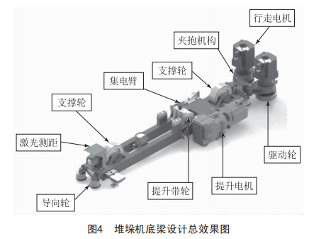 在快速堆垛機的機械設(shè)計開發(fā)中,整機設(shè)計方面總體思路如下:利用三維仿真分析軟件平臺化設(shè)計,整體機架采用輕量化設(shè)計理念,最大限度減小整機重量,節(jié)能降耗。整機重量減輕、提升機構(gòu)減輕,能夠減小電機無用功率,滿足高速響應(yīng)要求,減少慣性沖擊。同時,采用低重心設(shè)計,底盤重、上部輕,以降低整機重心,達到快速精準停車及減少搖晃的效果。堆垛機整機設(shè)計總效果圖如圖3所示。
