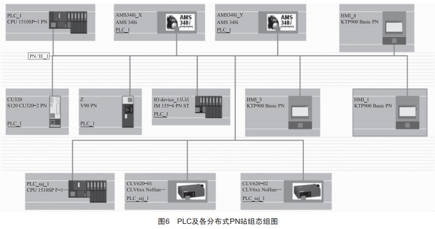 硬件基本配置:CPU151OSP-PN、TP900、IM155-6PN、s120CU320-2PN、AMs348i、V90PN等:所有智能Io設(shè)備組成Profinet網(wǎng)絡(luò),通過PN通信、等時同步實時通信、通信報文接口進行控制。PLC及各分布式PN站組態(tài)組圖如圖6所示。