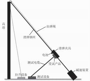 高塔滑彈法通常包括單股鋼絲滑彈法或雙股鋼絲滑彈法。通用性更強的單股鋼絲滑彈法示意圖如圖1所示,其原理是先從一定的地面高度斜拉一條具有一定角度的鋼絲,在鋼絲的下端設(shè)置減速裝置,將受試產(chǎn)品通過拉升設(shè)備拉升到一定高度后釋放受試產(chǎn)品,受試產(chǎn)品沿鋼絲向下做自由運動,到減速裝置處進行回收,受試產(chǎn)品下滑過程中,通過測試電纜由地面測試設(shè)備獲取相關(guān)彈目交匯信息,測試設(shè)備對彈目信息進行處理,實現(xiàn)對受試產(chǎn)品相關(guān)性能的考核驗證。由圖1可知,鋼絲的長度根據(jù)模擬的彈目交匯長度而定(高塔高度一般不小于100m),鋼絲的角度可以根據(jù)彈目交匯的角度而定。對于每一次滑彈試驗,當(dāng)受試產(chǎn)品從一定高度以一定速度運動到鋼絲下端減速裝置時,不可避免地會受到振動沖擊,該沖擊很容易造成產(chǎn)品零部件松動或者隱性損害,嚴重時還會導(dǎo)致產(chǎn)品解體,嚴重影響產(chǎn)品的可靠性。