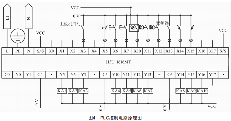 本系統(tǒng)選擇匯川H3U一1616MTPLC作為主控制器,選擇SV610伺服驅(qū)動(dòng)器作為執(zhí)行機(jī)構(gòu),控制輸送、收帶、壓帶電機(jī)運(yùn)行。SV610伺服驅(qū)動(dòng)器是匯川研制的高性能中小功率的交流伺服驅(qū)動(dòng)器,支持Modbus、CANopen等通信協(xié)議。采用昆侖通泰HMI觸摸屏作為人機(jī)界面,負(fù)責(zé)參數(shù)設(shè)置和運(yùn)行狀態(tài)監(jiān)控。機(jī)器視覺(jué)檢測(cè)采用MGS502(M)一H2千兆網(wǎng)工業(yè)相機(jī),像素5.0MP。激光測(cè)距傳感器采用4~20mA模擬量輸出。PLC數(shù)字量接口地址分配如表1所示,PLC控制電路如圖4所示。