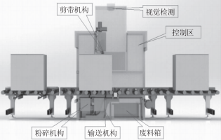 如圖)所示,輸送線上部設(shè)置有剪帶裝置,通過(guò)視覺(jué)檢測(cè),確保每根打包帶的位置準(zhǔn)確,并合理避讓存在有礙裁剪的風(fēng)險(xiǎn),如金屬扣等的位置,通過(guò)輸送機(jī)構(gòu)的精準(zhǔn)調(diào)節(jié),減少對(duì)裁剪設(shè)備的損傷,延長(zhǎng)設(shè)備的使用壽命。輸送帶的底部設(shè)置有打包帶的回收及粉碎機(jī)構(gòu),回收機(jī)構(gòu)將已經(jīng)剪斷了的打包帶統(tǒng)一集中到設(shè)備中部,通過(guò)下拉機(jī)構(gòu)將打包帶拖入粉碎機(jī)構(gòu)中進(jìn)行粉碎,從而大大減小了打包帶的體積,減少了員工規(guī)整打包帶的時(shí)間,避免了因打包帶過(guò)長(zhǎng)或剪切部位過(guò)于鋒利造成的人員傷害,更利于打包帶的二次回收利用。