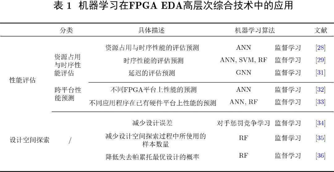 機器學習技術(shù)的引入為解決上述問題提供了一種新的思路。機器學習技術(shù)在HLS中的應用主要包括性能評估以及設計空間的探索等兩方面,具體如表1所示。