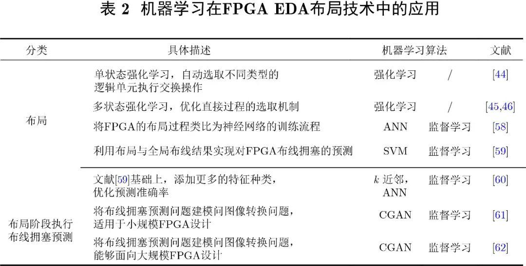 由于過去30余年FPGA架構(gòu)的不斷演進,現(xiàn)代FPGA擁有數(shù)以千計的DSP、RAM以及數(shù)百萬個查找表(Look-Up Table, LUT)和觸發(fā)器(Flip-Flop, FF)實例,這些異構(gòu)資源通常完全分散在FPGA架構(gòu)的離散位置上,這種復雜性和異構(gòu)性對現(xiàn)代FPGA布局器的運行效率和結(jié)果質(zhì)量提出了嚴峻的挑戰(zhàn),將機器學習與傳統(tǒng)布局方法相結(jié)合是解決上述問題的有效途徑,具體如表2所示。