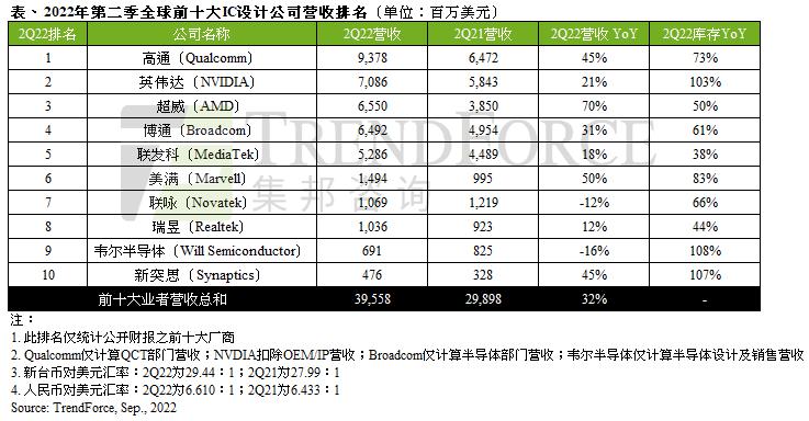 2022年第二季全球前十大IC設(shè)計(jì)業(yè)者營收年增32%,下半年考驗(yàn)庫存去化能力