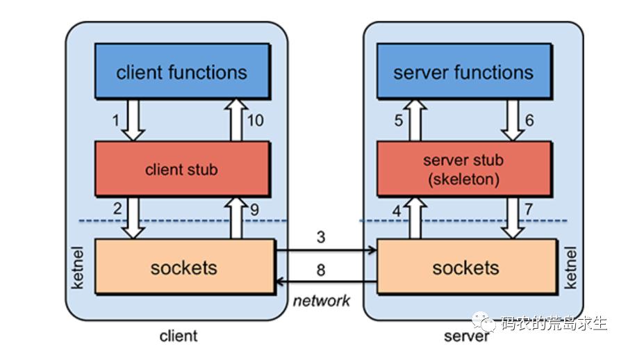 只不過對(duì)于服務(wù)A來說并不想關(guān)心網(wǎng)絡(luò)傳輸這樣的底層細(xì)節(jié),如果能像調(diào)用本地函數(shù)一樣調(diào)用遠(yuǎn)程服務(wù)就好了,這就是所謂的RPC,經(jīng)典的實(shí)現(xiàn)方式是這樣的: