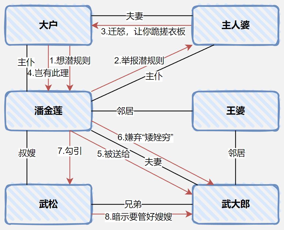 以上,就是把這些信息挖掘出來,用粗略點(diǎn)的圖示可以大概勾畫出來人物的關(guān)系和行為動作: