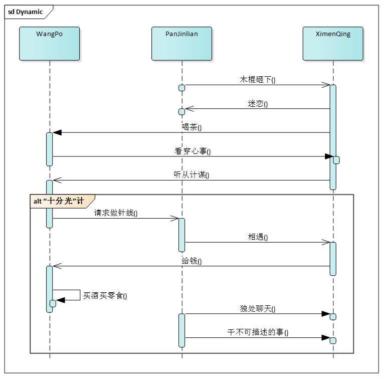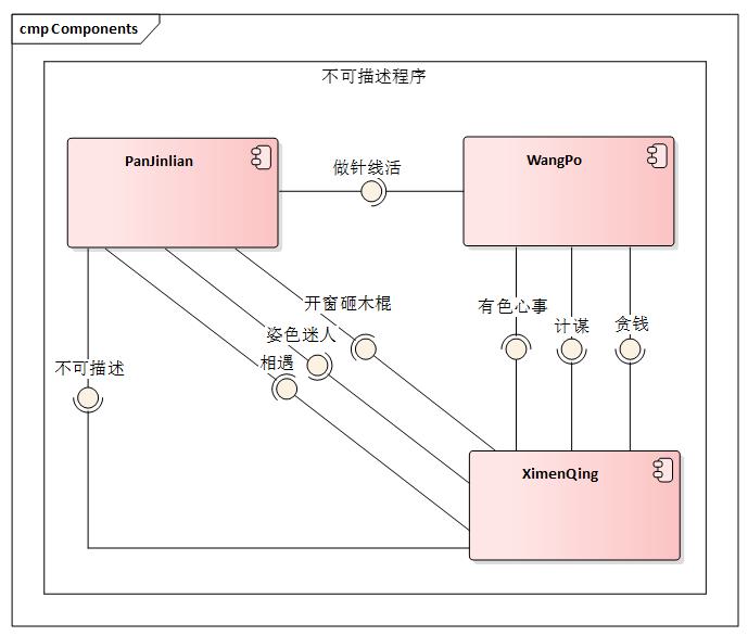 上專業(yè)的設(shè)計(jì)工具EA,為了簡要說明這個(gè)不可描述的情節(jié),部分需求沒有完全體現(xiàn)在這架構(gòu)里面。(這里省略了WuDalang的角色)