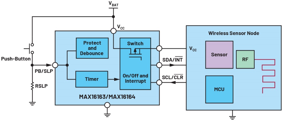 MAX16163/MAX16164是ADI公司的nanopower控制器,具有開/關(guān)控制器和可編程休眠時間特性。該器件集成一個電源開關(guān)來選通輸出,可提供高達(dá)200mA的負(fù)載電流。MAX16162/MAX16163可取代傳統(tǒng)負(fù)載開關(guān)、RTC和電池“保鮮(freshness)”IC,以減少物料清單(BOM)的數(shù)量并降低成本。無線傳感器節(jié)點單元通過MAX16162/MAX16163連接到電池。休眠時間可通過微控制器進(jìn)行編程設(shè)置,也可使用PB/SLP與地之間的外部電阻或使用微控制器的I2C命令來設(shè)置。外部按鈕用于退出器件的運輸模式。