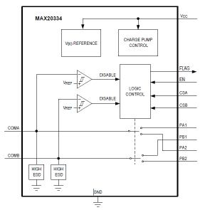 所有引腳均采用了ESD保護結(jié)構(gòu),以防止在處理和組裝過程中遭受高達±2kV(人體模型)的靜電放電。COMA和COMB(圖2和圖3)進一步受到高達±15kV(人體模型)、±15kV(IEC 61000-4-2中描述的氣隙放電方法)和±8kV(IEC61000-4-2中描述的接觸放電方法)的ESD保護,且不會造成損壞。ESD結(jié)構(gòu)在正常運行和設(shè)備斷電時均可承受高ESD。即便在ESD事件之后,此IC也會繼續(xù)工作,而不會發(fā)生閂鎖。經(jīng)測試,該IC可受到-30V至+45V (IEC61000-4-5)的浪涌保護和高達+20.5V的過壓保護。