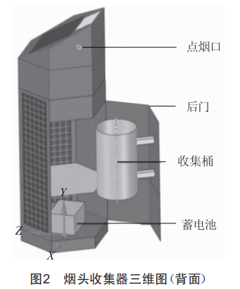 要實現(xiàn)收集器的各項功能,需配合傳感器和PLC控制。通過三維設計軟件進行結構建模,保證煙頭收集器各部件加工和安裝過程中機械部件合理配合,不發(fā)生相互干涉。收集器主體分為上、中、下三部分。上部的頂板有一塊LED屏幕和一塊光伏板,內部放置電路控制硬件部分和wi-Fi接收發(fā)送模塊、位置定位模塊:側面安裝有兩個點煙裝置。中間部分為煙頭熄滅及投遞入口。下部正面的3個側面安裝有3塊光伏板,用于將太陽能轉化為電能,背面開有后門(圖2),內部分為上、下兩層,上層放置煙頭收集桶(內桶)固定于旋轉門上,下層存放蓄電池,蓄電池用于儲存光伏板產(chǎn)生的電能,同時為其他系統(tǒng)部件供電。旋轉門可繞邊緣軸線轉動打開,同時將內桶移到外部,便于環(huán)衛(wèi)工人清理煙頭(圖2)。
