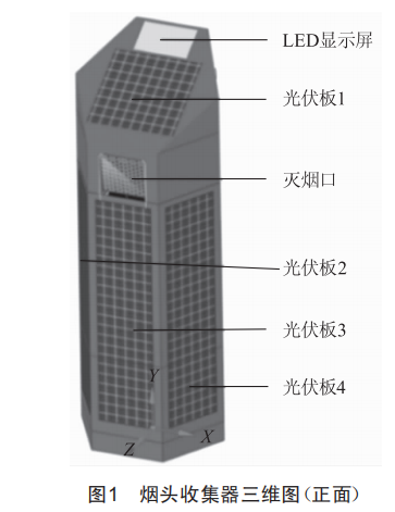 利用三維設計軟件,設計了多功能煙頭收集器,其三維模型的正面如圖1所示。收集器主體為正六邊形結構,總高度1100mm,剖面六邊形邊長為110mm:頂部為斜面,與水平面夾角為27°:LED屏幕大小為177mm×101mm,光伏板1尺寸為170mm×1.0mm,光伏板1、3、4尺寸均為700mm×170mm。收集器三維結構背面如圖1所示,旋轉門在打開狀態(tài),內桶(收集桶)為直徑120mm的圓柱殼體。