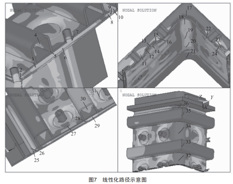 為評定主體結(jié)構(gòu)應(yīng)力狀況,將主體結(jié)構(gòu)各危險(xiǎn)點(diǎn)處的應(yīng)力進(jìn)行線性化處理,在選擇應(yīng)力線性化路徑時(shí),須經(jīng)過評定區(qū)域應(yīng)力強(qiáng)度值最大的位置和各個典型結(jié)構(gòu)位置。最短應(yīng)力線性化路徑,可作為應(yīng)力線性化路徑的最佳選擇,該路徑可以理解為裂紋擴(kuò)展導(dǎo)致破壞的最危險(xiǎn)路徑。