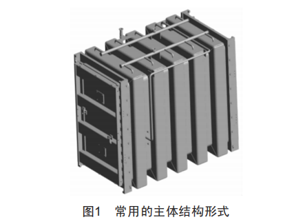 目前矩形截面滅菌器常用壓力容器的主體結(jié)構(gòu)為內(nèi)殼一加強(qiáng)筋(外殼)形式,內(nèi)殼外覆加強(qiáng)筋,該加強(qiáng)筋同時(shí)作為外殼與內(nèi)殼組成夾套結(jié)構(gòu)。滅菌器常用主體結(jié)構(gòu)如圖1所示。