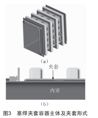 基于以上問題,設(shè)計(jì)團(tuán)隊(duì)開發(fā)了一套新的主體結(jié)構(gòu)形式:塞焊外殼外加強(qiáng)結(jié)構(gòu)滅菌器主體。該滅菌器加工了特殊結(jié)構(gòu)的外殼,外殼開拉伸孔作為塞焊孔,通過該塞焊孔可以直接將滅菌器內(nèi)殼、外殼固定到一起。因?yàn)橥鈿ど系娜缚诪槔炜?成型后內(nèi)殼、外殼之間將形成一個狹小空間,即作為滅菌器的夾套。內(nèi)殼、外殼組合成一個整體,而加強(qiáng)筋結(jié)構(gòu)附加到外殼外部,不再作為承壓的殼體。內(nèi)殼、外殼之間的夾套空間較常用結(jié)構(gòu)減小約80%,結(jié)構(gòu)非常緊湊。新結(jié)構(gòu)的主體結(jié)構(gòu)夾套容積小、成型簡單,對內(nèi)殼的包覆和支撐性能好,節(jié)能環(huán)保、安全可靠,保溫性和外加保溫層后實(shí)現(xiàn)的隔熱效果優(yōu)異。該主體結(jié)構(gòu)及夾套形式如圖3所示。