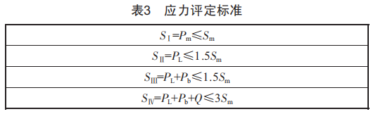 根據(jù)《鋼制壓力容器一分析設(shè)計(jì)標(biāo)準(zhǔn)》(JB4732一95)的要求,需要將結(jié)構(gòu)危險(xiǎn)點(diǎn)按一次總體薄膜應(yīng)力Pm、一次局部薄膜應(yīng)力PL、一次彎曲應(yīng)力Pb、二次應(yīng)力Q等不同類的應(yīng)力以及組合的當(dāng)量應(yīng)力進(jìn)行校核,評定標(biāo)準(zhǔn)如表3所示。