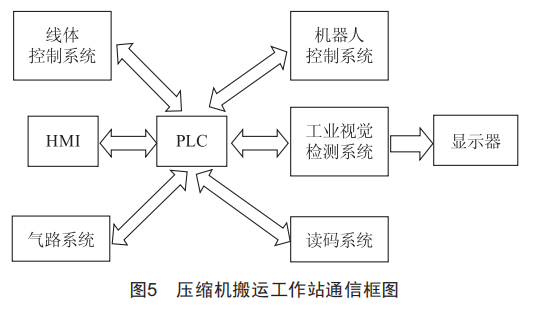 壓縮機(jī)搬運(yùn)工作站是全自動(dòng)生產(chǎn)的工作站,需要內(nèi)部各控制系統(tǒng)之間按照程序設(shè)定的邏輯聯(lián)動(dòng),其控制系統(tǒng)主要由可編程序控制器(簡(jiǎn)稱PLC)、機(jī)器人控制系統(tǒng)、工業(yè)視覺檢測(cè)系統(tǒng)、線體控制系統(tǒng)和氣路系統(tǒng)等組成。PLC作為控制核心,通過CC-Link通信總線與各控制系統(tǒng)進(jìn)行通信,并收集信號(hào)反饋、做出判斷后,輸出動(dòng)作指令。通信框圖如圖5所示。