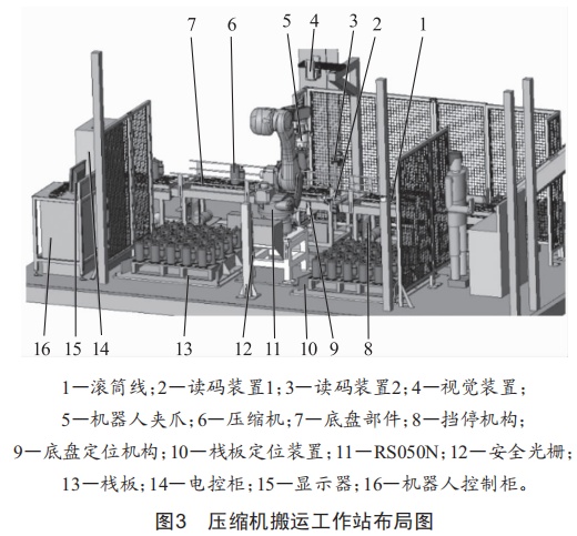 壓縮機(jī)搬運(yùn)工作站由3段滾筒線、4套擋停機(jī)構(gòu)、1套底盤定位機(jī)構(gòu)、2套讀碼裝置、1套視覺裝置、1臺(tái)KawaSakiRS050N六軸機(jī)器人、定制夾爪、棧板定位裝置、電控柜配套氣動(dòng)系統(tǒng)等組成,壓縮機(jī)搬運(yùn)工作站布局如圖3所示。