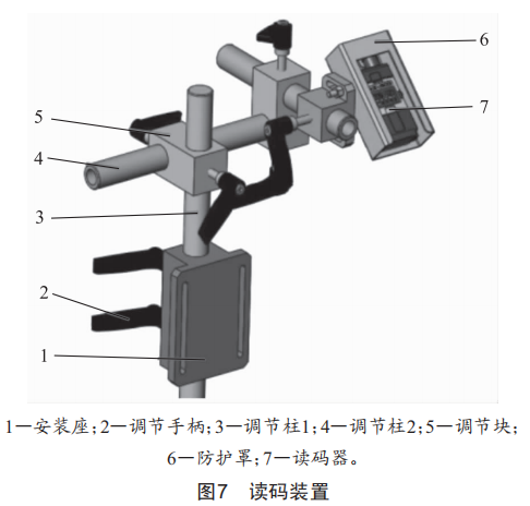 同一型號(hào)室外機(jī)中的底盤部件與壓縮機(jī)型號(hào)是匹配的,為了防止用錯(cuò)型號(hào),在底盤部件底泡和壓縮機(jī)上貼有SN碼,裝配壓縮機(jī)后需分別使用讀碼器讀取兩者SN碼,上傳到MES系統(tǒng)中進(jìn)行比對(duì)。原來使用人工掃碼費(fèi)時(shí)費(fèi)力,取消人工后在滾筒線兩側(cè)各安裝一套讀碼裝置,如圖7所示,其上安裝有C0GNExDataMan262讀碼器,可自動(dòng)讀取SN碼,省時(shí)省力。
