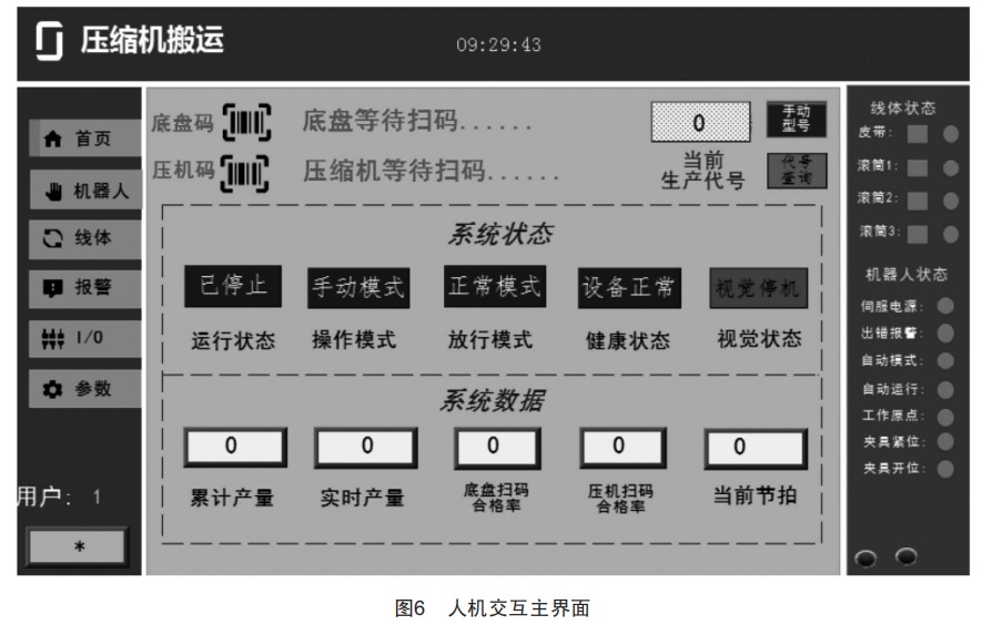 工作站人機(jī)交互通過wEINVIEwMT8071IE觸摸屏進(jìn)行,可在觸摸屏上顯示機(jī)器人、線體、視覺和讀碼器運(yùn)行狀態(tài),修改設(shè)備相關(guān)參數(shù),記錄設(shè)備報(bào)警信息,監(jiān)視I/0信息,也可隨時(shí)查看產(chǎn)量、合格率、節(jié)拍等實(shí)時(shí)數(shù)據(jù)信息,最終達(dá)到可視化管理的目的。人機(jī)交互主界面如圖6所示。