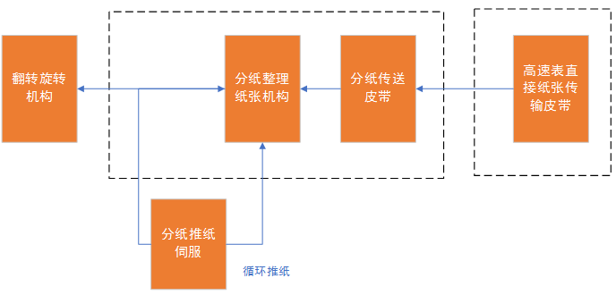 在收紙部分整理好的紙張,同時(shí)翻紙籠已經(jīng)下降到分紙位置,然后分紙部分通過(guò)伺服控制推紙。紙張進(jìn)入翻紙籠之后,跟隨翻紙的工藝選擇翻紙部分動(dòng)作。翻紙上升完畢,再次推紙,然后收紙部分整理收紙。