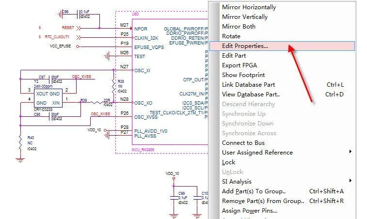 切換到原理圖目錄頁,選中原理圖根目錄或者是其中某一頁的原理圖,點(diǎn)擊右鍵,編輯器件屬性,如圖3-48所示;