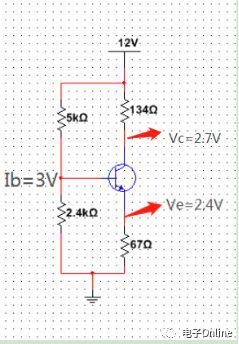視頻中講到過,“三極管工作在放大狀態(tài),就是不能夠讓它工作在飽和區(qū)和截止區(qū)”。那根據(jù)這一個(gè)結(jié)論,我們知道,當(dāng)三極管工作在截止?fàn)顟B(tài)時(shí),Vce=0.3V;同時(shí)在“有偏置放大電路”的設(shè)計(jì)視頻中有講解到,有偏置電路中的E極是受B極的電壓影響的,同時(shí)根據(jù)實(shí)際需求,我們通常將設(shè)置在2~3V間。視頻中我們將Vb設(shè)置在3V,則Ve就為2.4V。