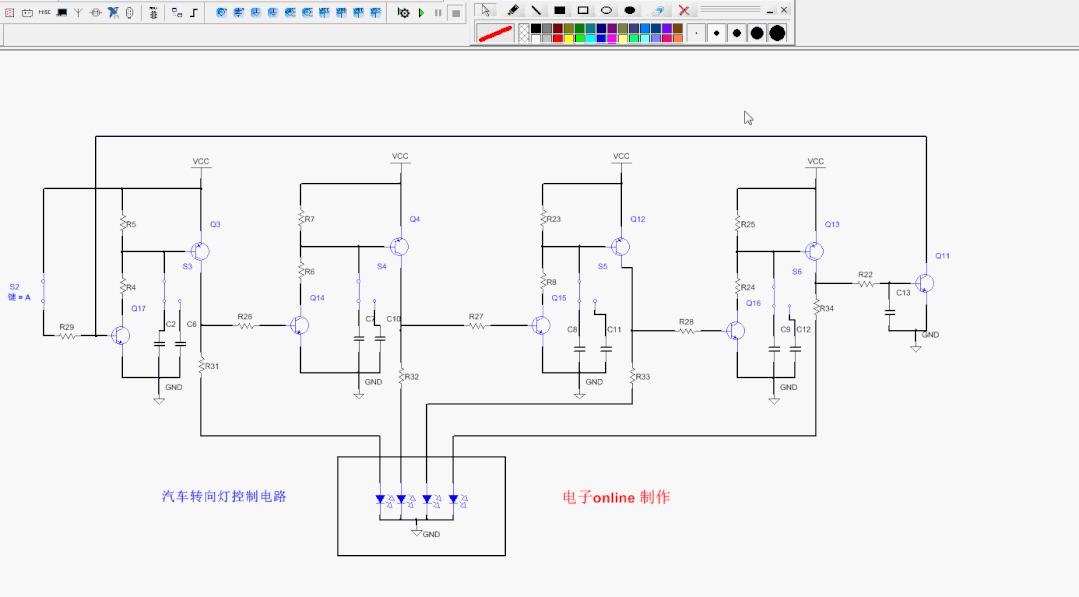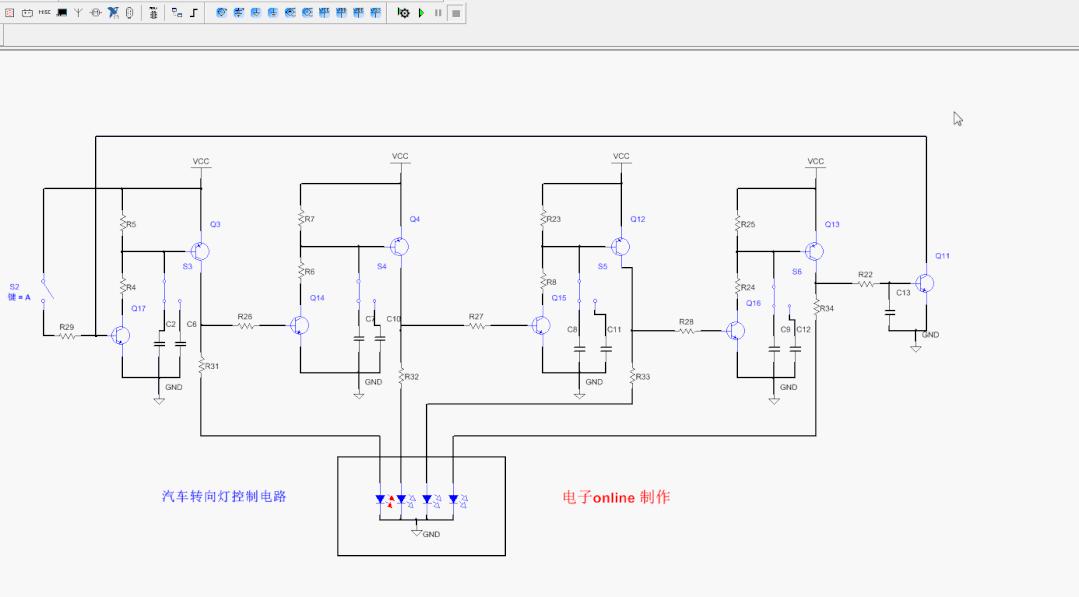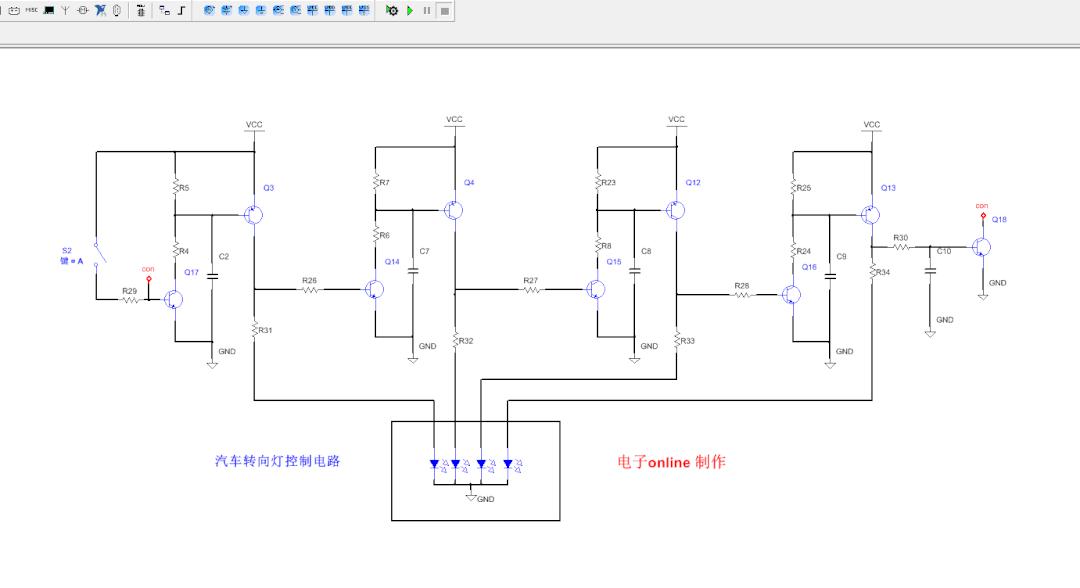 今天要設(shè)計(jì)汽車尾燈(轉(zhuǎn)向燈)電路效果如下圖所示: