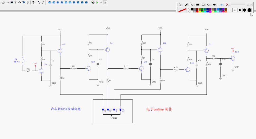 二、當(dāng)轉(zhuǎn)向開關(guān)被按下時(shí),NPN流過Ib電流,所以NPN導(dǎo)通,此時(shí)PNP也會(huì)流過Ib電流,PNP也會(huì)導(dǎo)通。所以LED獲得電壓,從而被點(diǎn)亮。