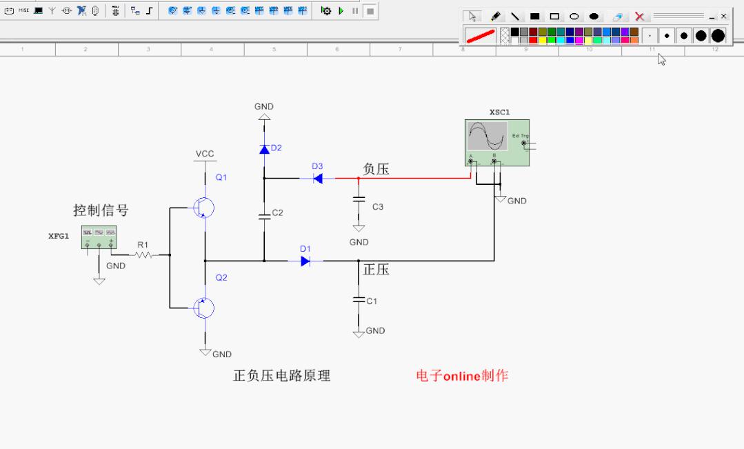 當(dāng)控制信號由高電平轉(zhuǎn)為低電平時(shí),Q4導(dǎo)通,由于C2的電壓是下正上負(fù),所以C2會通過Q2、D3給C3充電,根據(jù)充電方向,C3的電壓也是下正上負(fù),所以C3便輸出負(fù)電壓。