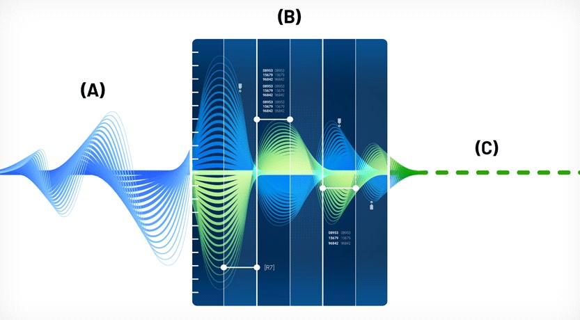 ANC應(yīng)用程序“監(jiān)聽”不需要的外部引擎噪音,然后(A)播出一個與相位相差180度的聲音(B),這樣,噪音還未傳到您耳中就已被“消除”(C)。數(shù)字處理必須非??觳拍芡瓿蛇@一任務(wù)。