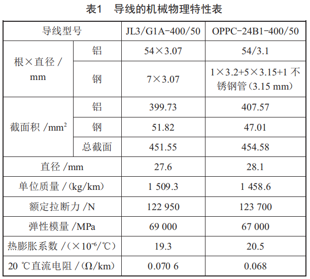 以某220kV線路為例,該線路在20mm重冰區(qū)及相鄰的15mm冰區(qū),共計7.417km范圍內(nèi)采用一根OPPC-24B1-400/50與JL3/G1A-400/50高導(dǎo)電率鋼芯鋁絞線組成右相導(dǎo)線。兩種導(dǎo)線的參數(shù)如表1所示。