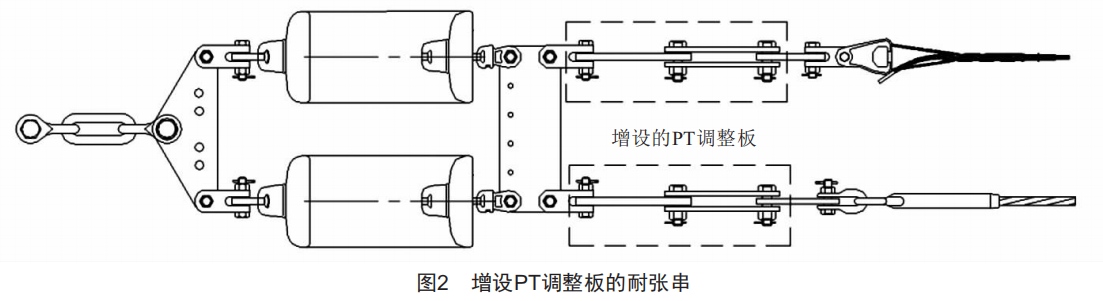 從表3可以看出,檔1和檔7的最大弧垂差的計算值超過了驗收規(guī)范的要求。但由于間隔棒的牽引作用,兩者的弧垂差會分布到各個次檔距之中,而不會集中體現(xiàn)在檔中央的最大弧垂處,因此實際測量的最大弧垂差比理論值均要小。即使如此,弧垂大一側(cè)子導(dǎo)線通過間隔棒的牽扯,會導(dǎo)致另一側(cè)子導(dǎo)線及金具承受較大負荷以及間隔棒處的集中荷載,對長期運行不利。因此,如圖2所示,在兩端耐張串上各子導(dǎo)線金具上增設(shè)一塊PT調(diào)整板,與已有的DB調(diào)整板形成一組級差較小的弧垂調(diào)節(jié)器,在觀測到弧垂出現(xiàn)影響線路運行的差值時,對其進行調(diào)整。
