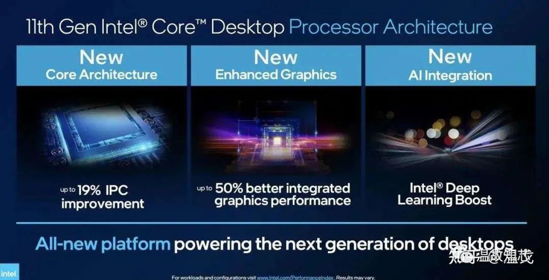 架構(gòu)對一個芯片的性能來說也是至關(guān)重要的--以Intel最新發(fā)布的第11代酷睿處理器Rocket Lake-S為例,新的架構(gòu)為其帶來了約 19% 的 IPC (每時鐘指令數(shù))提升,以及更好的 AI 性能。