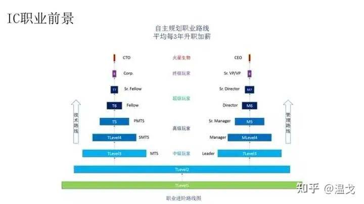 對于IC設(shè)計(jì)職位的晉升,無論是走技術(shù)路線還是管理路線,在工作的前六年主要精力都放在技術(shù)提升上,并無太大差別。職級提升大概如下:碩士畢業(yè)0~3年(對應(yīng)本科0~5年):level 1碩士畢業(yè)3~6年(對應(yīng)本科5~8年):level 2碩士畢業(yè)6+年(對應(yīng)本科8+年):level 3