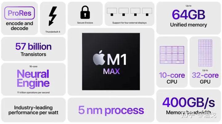 幾乎和倚天710發(fā)布同一時(shí)間,蘋果發(fā)布了M1 Max芯片,也是5nm工藝,晶體管數(shù)量達(dá)到570億個(gè),CPU核心還是八大二小共10個(gè),神經(jīng)引擎核心還是16個(gè)。
