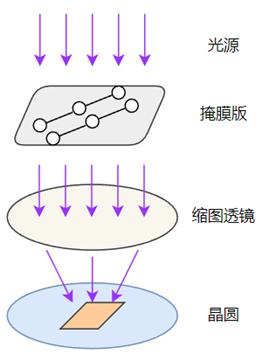 將涂光刻膠后的晶圓放入光刻機中,光刻機的光源發(fā)出的深紫外(DUV)或極紫外(EUV)光透過掩模版(也稱作光罩),將掩膜版上的電路結(jié)構(gòu)圖案縮小并聚焦到光刻膠圖層上,光刻膠在受光后,受光區(qū)域會發(fā)生化學(xué)變化,掩膜版上的電路圖形就會印刻到光刻膠圖層上,此步驟稱為曝光,如下圖所示。曝光之后的步驟是烘烤和顯影,目的是去除圖形未覆蓋區(qū)域的光刻膠,從而讓印刷好的電路圖案顯現(xiàn)出來,永久固定。