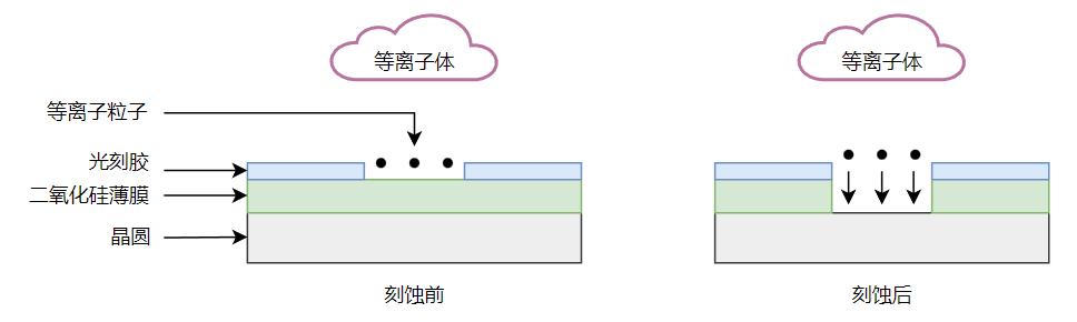 刻蝕(etch)是在光刻步驟完成后,用化學(xué)或物理方法有選擇地從硅片表面去除不需要的材料,從而只留下3D電路圖的過程??涛g方法主要包括濕法刻蝕(wet etching)和干法刻蝕(dry etching),濕法刻蝕是指利用化學(xué)溶液與預(yù)刻蝕材料之間的化學(xué)反應(yīng)來去除未被掩蔽膜材料掩蔽的部分而達到刻蝕目的。干法刻蝕是用等離子體化學(xué)活性較強的性質(zhì)進薄膜刻蝕的技術(shù),干法刻蝕又包括濺射刻蝕(Supptter Etching)、等離子體刻蝕(Plasma Etching)、反應(yīng)離子刻蝕(Reactive Ion Etching,RIE)。刻蝕過程以等離子體刻蝕為例,利用等離子體中的粒子,撞擊二氧化硅薄膜層,達到去除多余氧化層的目的,如下圖所示。