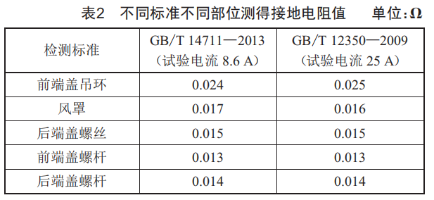 從《中小型旋轉(zhuǎn)電機(jī)通用安全要求》(GB/T14711一2013)和《小功率電動(dòng)機(jī)的安全要求》(GB/T12350一2009)相關(guān)試驗(yàn)方法分析,其測(cè)試路徑都是從接地裝置到電動(dòng)機(jī)易觸及的接地金屬部件之間的電流路徑,且試驗(yàn)結(jié)果判定值都應(yīng)不大于0.1Ω,在測(cè)試路徑和試驗(yàn)結(jié)果上一致。但在試驗(yàn)電流方面,GB/T14711一2013采用電機(jī)全定額輸入或輸出時(shí)的電流,GB/T12350一2009采用等于器具額定電流1.5倍或25A(兩者取較大值)的電流,兩者存在差異。