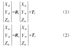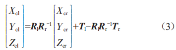 相機標(biāo)定的目的是獲得相機的內(nèi)外參數(shù)和畸變參數(shù),求出世界坐標(biāo)系與像素坐標(biāo)系之間的關(guān)系,常用的標(biāo)定方法是張正友標(biāo)定法[4]。雙目標(biāo)定與單目標(biāo)定的不同之處在于雙目標(biāo)定除了需要單目標(biāo)定的參數(shù)外,還有兩個相機之間的相對位置關(guān)系。一般都是以左相機為坐標(biāo)參考系,得出右相機相對于左相機的旋轉(zhuǎn)、平移關(guān)系。