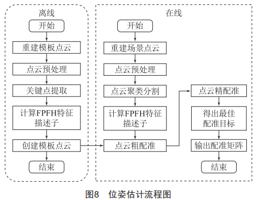 為能高效率地實現(xiàn)位姿估計,完成定位,將流程分成兩個部分,模板點云采用離線操作,場景點云的位姿矩陣計算則利用在線部分的三維重建與模板點云進(jìn)行配準(zhǔn)。位姿估計流程圖如圖8所示。