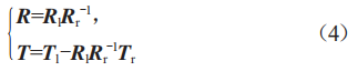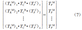 分別定義7CR、7PC、7MR、7PM為機械臂基座坐標(biāo)系R與相機坐標(biāo)系C、相機坐標(biāo)系C與標(biāo)定板坐標(biāo)系P、機械臂基座坐標(biāo)系R與機械臂末端執(zhí)行器坐標(biāo)系M、機械臂末端執(zhí)行器坐標(biāo)系M與標(biāo)定板坐標(biāo)系P之間的轉(zhuǎn)換關(guān)系。