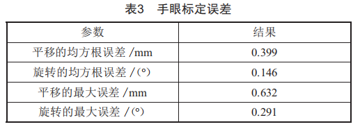 式(8)用于求解AX=XB,AX主要與R和M有關(guān),XB主要與C和P有關(guān)。最后將問題轉(zhuǎn)換成求解旋轉(zhuǎn)、平移矩陣,即完成手眼標(biāo)定。得到的標(biāo)定誤差如表3所示。