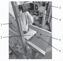 1一機器人:2一吸盤:3一投影儀:4一相機:5一傳送帶:6一異構(gòu)件。