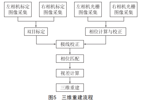 (2)三維重建:左右相機分別采集帶有正弦光柵的12張圖片,基于三頻四步外差法以及相位校正對相位展開獲得左右相位圖,對相位圖進(jìn)行極線校正后完成相位匹配,得到待測物的視差圖。根據(jù)視差圖計算每個點的深度信息,獲得Z坐標(biāo),再計算出每個點的X、Y坐標(biāo),以點云的形式表達(dá)出來并保存,完成三維重建。
