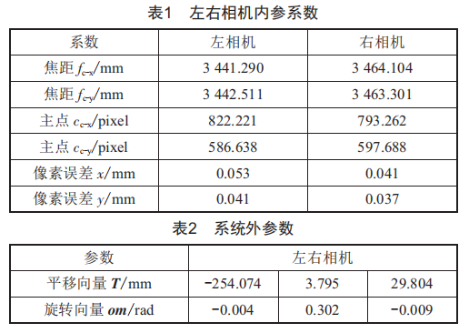使用MATLAB的標(biāo)定工具箱,角點識別標(biāo)定板完成單目標(biāo)定與雙目標(biāo)定。得到的雙目標(biāo)定各參數(shù)結(jié)果如表1、表2所示。