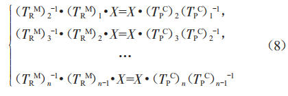 機械臂基座坐標(biāo)系R與相機坐標(biāo)系C的關(guān)系是保持不變的,標(biāo)定板固定在機械臂末端,所以機械臂末端執(zhí)行器坐標(biāo)系M與標(biāo)定板坐標(biāo)系P也保持不變,因此求解的7CR和7PM實際上是不變的矩陣。