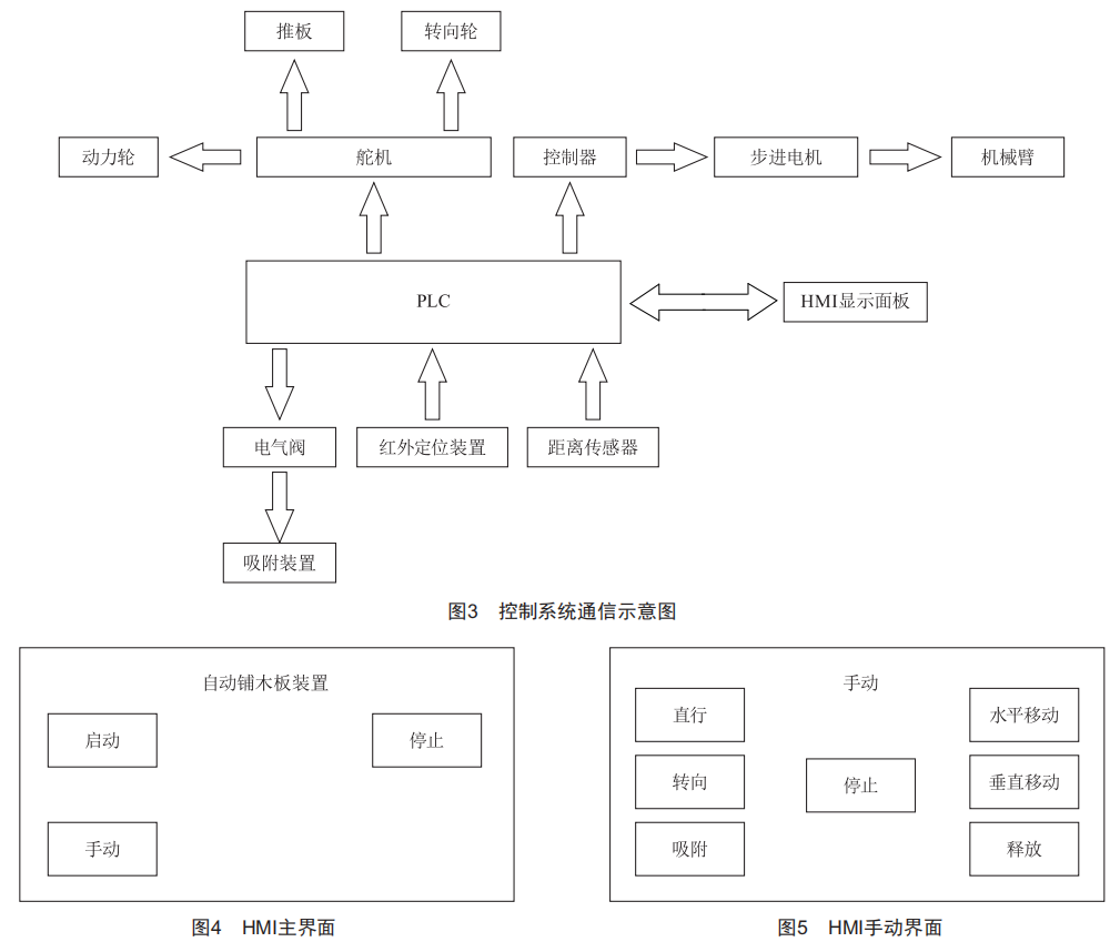 選擇西門子s7-1200作為控制系統(tǒng),因?yàn)樵谖恢每刂品矫?PLC技術(shù)的應(yīng)用可以確保位置的精準(zhǔn)性與工作效率,大大降低位置偏差發(fā)生的概率[4]。而且與傳統(tǒng)控制技術(shù)相比較,PLC技術(shù)具有可靠性高、實(shí)用性強(qiáng)、編程簡(jiǎn)單、學(xué)習(xí)難度低等優(yōu)點(diǎn)[5]。編程軟件用的是博圖軟件,通過(guò)編程軟件編寫控制程序,00.0、00.1為步進(jìn)電機(jī)的輸出連接,通過(guò)控制步進(jìn)電機(jī)的運(yùn)動(dòng)來(lái)控制機(jī)械臂前后以及上下運(yùn)動(dòng);00.2、00.3控制兩個(gè)電氣閥,通過(guò)控制電氣閥的開關(guān)來(lái)控制機(jī)械臂吸附木地板與放下木地板;通過(guò)總線控制4個(gè)舵機(jī)來(lái)控制動(dòng)力輪的前后運(yùn)動(dòng)、轉(zhuǎn)向輪的左右轉(zhuǎn)向和推板的運(yùn)動(dòng)。I0.0接通的是距離傳感器,根據(jù)設(shè)定的數(shù)值,在達(dá)到預(yù)定距離后距離傳感器會(huì)發(fā)送信號(hào)給I0.0,進(jìn)而通過(guò)PLC控制系統(tǒng)來(lái)控制木地板自動(dòng)鋪設(shè)裝置的轉(zhuǎn)向;I0.1接通的是紅外定位裝置,在鋪設(shè)過(guò)程中,木地板到達(dá)指定位置后,紅外定位裝置會(huì)給PLC發(fā)送信號(hào),使PLC控制機(jī)械臂把木地板放下??刂葡到y(tǒng)通信示意圖如圖3所示。