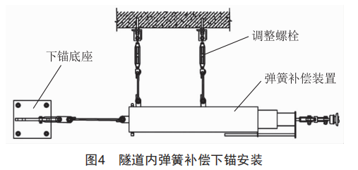 地鐵接觸網(wǎng)一般在隧道內(nèi)采用剛性懸掛,在隧道外采用柔性懸掛。但也經(jīng)常有兩段高架橋之間夾著一段小隧道,為減少剛?cè)徇^(guò)渡的次數(shù),通常會(huì)選擇在該段隧道內(nèi)設(shè)置柔性接觸網(wǎng),并在隧道內(nèi)設(shè)接觸網(wǎng)下錨。隧道內(nèi)彈簧補(bǔ)償裝置下錨的安裝方式如圖4所示,彈簧的中部和尾部均需通過(guò)隧道頂部進(jìn)行懸掛,并通過(guò)調(diào)整螺栓保持彈簧與下錨支線索的共線,彈簧尾部可根據(jù)需要固定在隧道側(cè)壁或通過(guò)下錨吊柱固定。