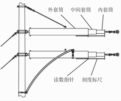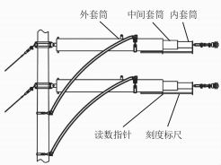 如圖1所示,彈簧補(bǔ)償裝置由內(nèi)部、外部彈簧通過(guò)套筒組裝而成,彈簧的材料采用高強(qiáng)度的彈簧鋼。裝置的頭、尾分別設(shè)連接雙耳,用于與線索下錨零件、錨固點(diǎn)之間的連接。外套筒的中部預(yù)留彈簧補(bǔ)償裝置的固定安裝雙耳,內(nèi)套筒的頭部安裝讀數(shù)標(biāo)尺。當(dāng)安裝完畢并按安裝曲線對(duì)接觸網(wǎng)線材施加張力后,內(nèi)部套筒被拉出,通過(guò)內(nèi)、外套筒與彈簧之間的傳導(dǎo),為接觸網(wǎng)提供恒定的張力輸出。
